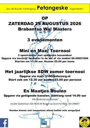 Op zaterdag 29 augustus  3 x feest voor; Maatjes Boulen, Jaarlijks SDW toernooi en voor Mini & Maxi.
